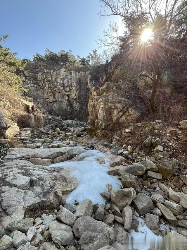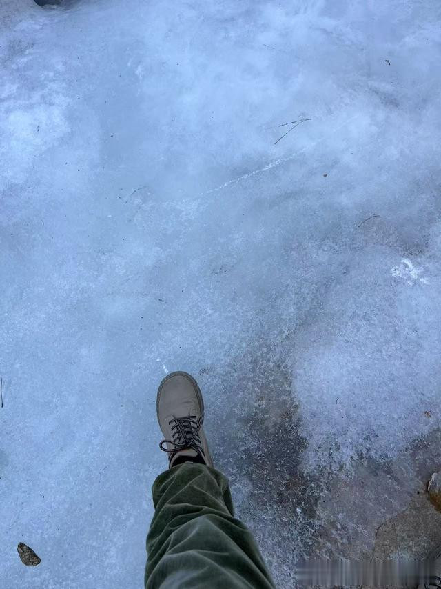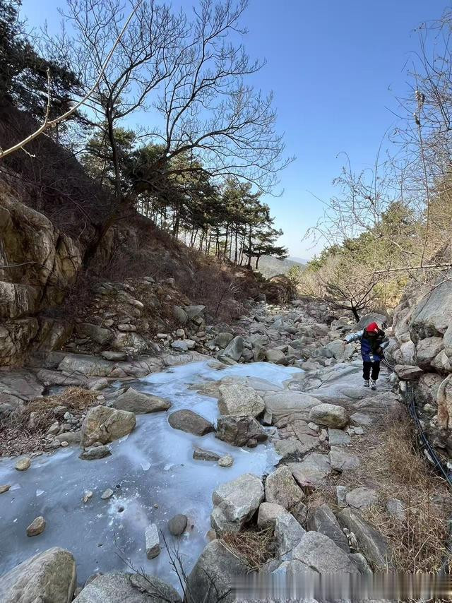 顺着河道时攀时爬,途中还看到了张大哥由深山里面引出来的几根黑色胶皮管,甚至还看到了不知冻了多久的厚厚的冰层。天空很蓝,阳光也明媚,但河道里残留的积水感受不到和煦的阳光,依然被冻得邦邦硬,踩在上面很滑很滑。