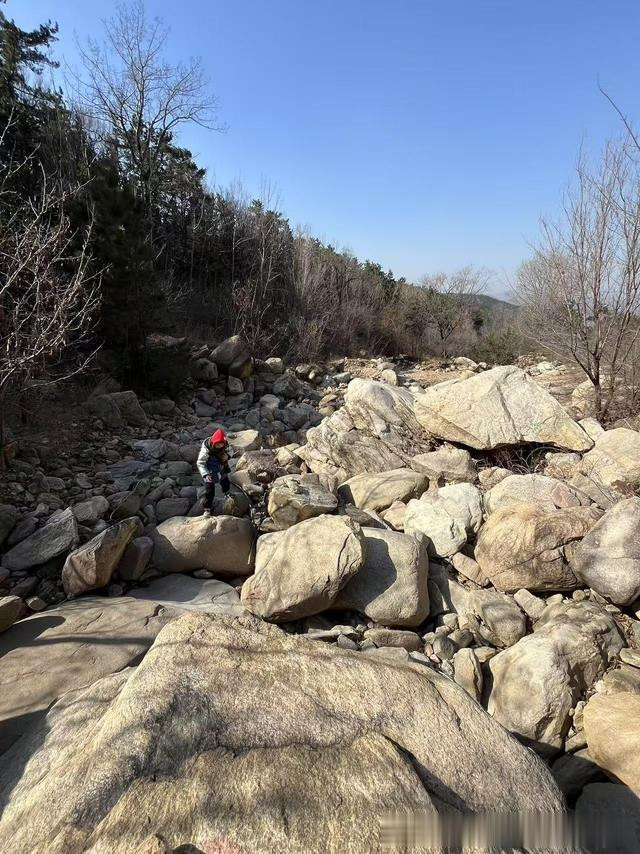 河道是蜿蜒曲折的,看不到前方的样子,头顶的太阳一会儿在正前方,一会儿又跑到了我们身后,转而又窜到了我们右侧。这里属于泰山深处,手机没有信号,除了山腰处张大哥那里的农家乐,再就是距离我们大概半径100米左右,却也不知道具体哪个方位的护林员大叔,此时此刻整条河道就俺娘儿俩个。