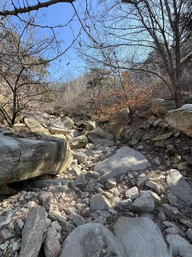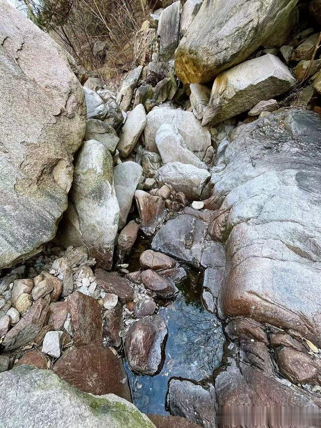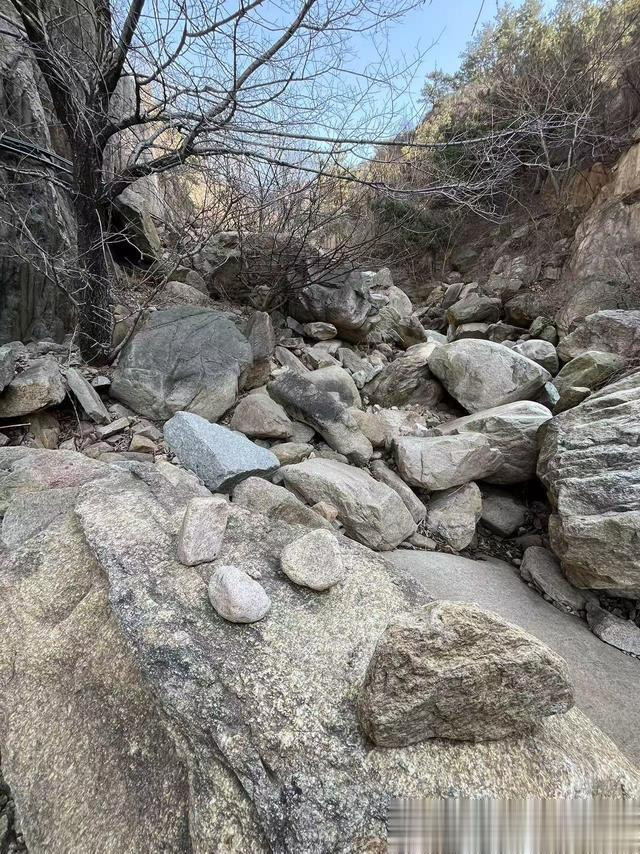 都说泰山石泰山石,但入目而来的各种大小不一的石块,有的圆咕噜嘟,有的则棱角分明,多数呈现的是白色,而非我们常见的那种墨绿色带白色花纹的样子。走在上面还得加倍小心,一个不注意绊倒了磕在石头上面,那就是“天使下凡,没变天仙先变了扁平的铁锨”。所以啊,也甭想着能遇到一块精美的泰山石了。